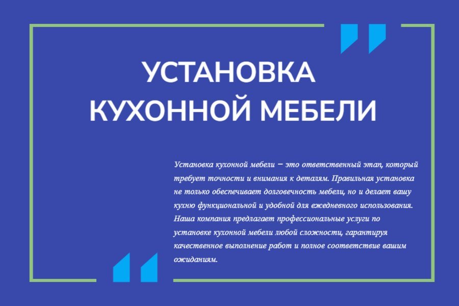 - Качество и надежность. Мы используем только профессиональные инструменты и проверенные крепежные материалы, что гарантирует долговечность и устойчивость установленной мебели. Вы можете быть уверены, что ваша кухня будет собрана качественно и прослужит вам долгие годы.